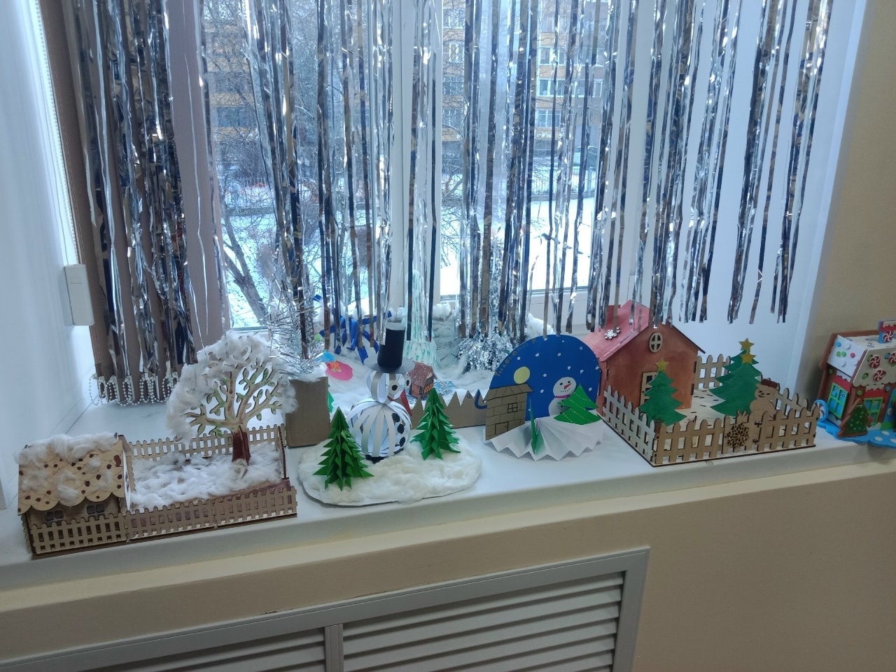 Разнообразные ёлочки, забавные снеговики, заснеженные домики, грациозный белоснежный олень и даже хоккейное поле и символ года розовые свинки – всё сделано руками детей и родителей.